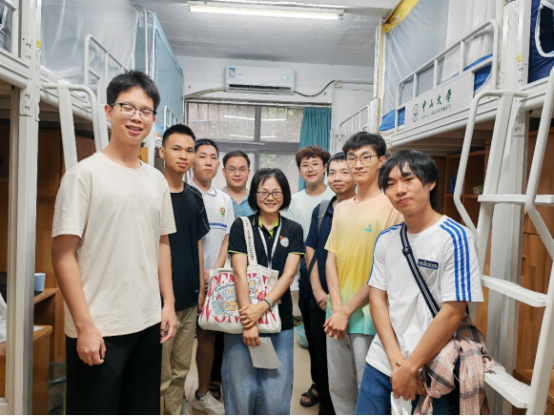 19日下午五点半,紧张的报到工作暂告一段落,数学学院(珠海)党委书记章向宏与党委副书记周剑芬兵分两路,会同王其如教授、杨毅助理教授、人事与党务秘书陈冬强老师、辅导员钟雨柔老师一行深入新生宿舍,开展走访慰问活动。