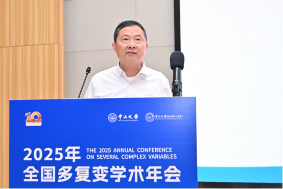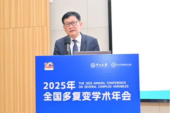 中山大学高松校长出席开幕式并致辞。他热烈祝贺年会的顺利召开,并向参会嘉宾致以诚挚的欢迎。他回顾了中山大学百年办学传统与“三校区五校园”的发展格局,并强调数学学科作为学校“双一流”优势学科,在教育部学科评估中位居前列,其中数学学院(珠海)十年来为校区发展提供了重要支撑。高校长回顾了我国多复变领域的起源与发展,国内研究起源于华罗庚先生,中山大学杰出校友陆启铿先生曾在该领域做出了里程碑式贡献,其提出的“陆启铿猜想”至今仍是国际数学界的重要研究课题。他特别提到,习近平总书记曾将多复变函数论的突破列为新中国重大基础研究成果之一。最后,他对我国多复变领域的发展前景表达了美好祝愿,期待年会深化合作交流,助推中山大学数学学科的创新发展。