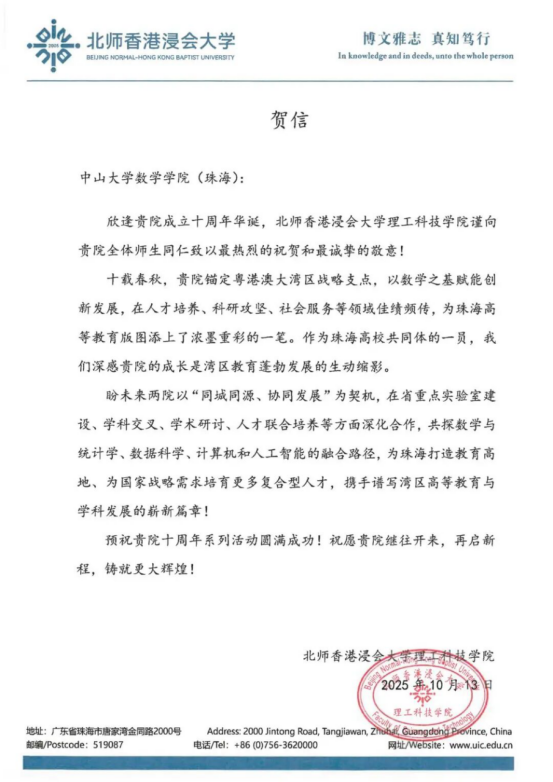 北师香港浸会大学理工科技学院送来贺信: